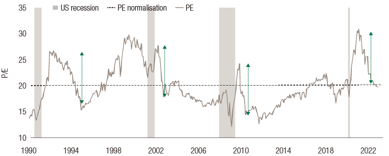 Reading note: green arrows indicate periods of post-recession PE normalisation. They have historically accompanied been by a positive performance for world indices.