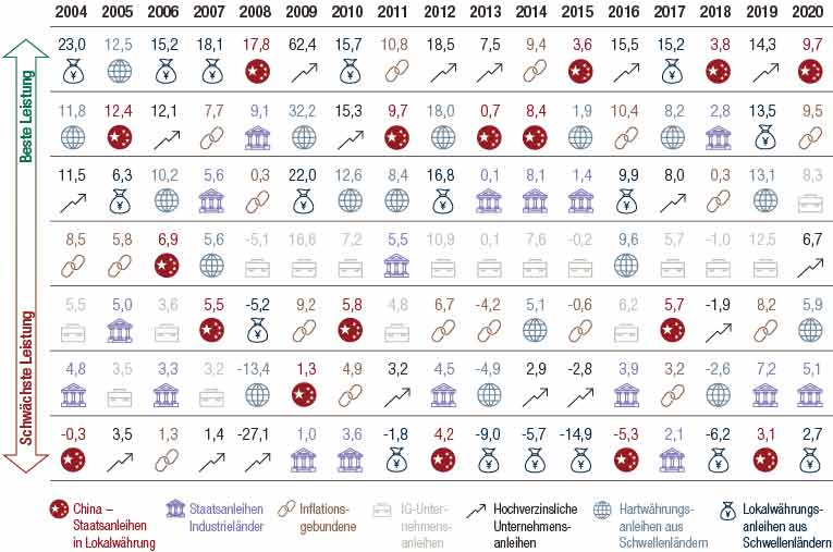 Quelle: Bloomberg. Die Angaben beziehen sich auf Jahresrenditen in Prozent. Dient nur zur Veranschaulichung. Die vergangene Wertentwicklung ist kein verlässlicher Indikator für künftige Erträge. Per 31. Dezember 2020. Staatsanleihen Industrieländer: Bloomberg Barclays Global Aggregate Treasuries (USD H); Inflationsgebundene Anleihen: Bloomberg Barclays Global Inflation-linked (USD H); IG-Unternehmensanleihen: Bloomberg Barclays Global Aggregate Corporate (USD H); Hochzins-Unternehmensanleihen: Bloomberg Barclays Global HY Corporate (USD H); Hartwährungsanleihen aus Schwellenländern: Bloomberg Barclays Global EM Sovereign Quasi Sovereign (USD); Lokalwährungsanleihen aus Schwellenländern: JPM GBI-EM Global Div. Composite (USD); Chinesische Staatsanleihen in Lokalwährung: Bloomberg Barclays China Aggregate Treasury Index (USD). Ein Verweis auf ein bestimmtes Unternehmen oder einen bestimmten Fonds stellt keine Empfehlung zum Kauf, Verkauf, Halten oder für eine Direktinvestition in das Unternehmen oder den Fonds dar.
