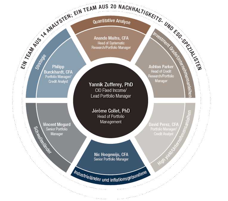 Beim Aufbau des Portfolios unserer unbeschränkten Total-Return-Strategie gilt: Gemeinsam ist man stärker. Wir sind überzeugt, dass ein Portfolio, das von einem Team von Spezialisten zusammengestellt wird, besonders geeignet ist, um das Alpha zu erhöhen. Deswegen arbeiten wir bei der Umsetzung unserer taktischen Vermögensallokation als Expertenteam zusammen, wobei jeder Experte die Funktion eines Portfoliomanagers (und nicht nur eines Analysten) in seinem Kompetenzbereich innehat und massgebende Entscheidungen treffen kann.