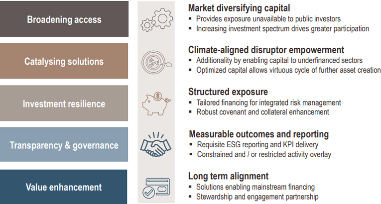 Forward-looking investors may identify public and private businesses that are mitigating climate risk and acting on the opportunities generated by the transition. Lombard Odier believes there are significant opportunities available to advance the transition to net zero through not just traditional public equity and debt markets, but also through private markets. While private equity capital has been well-deployed towards sustainable finance, we believe the broad versatility of solutions-oriented private credit is positioned to play an important role in accelerating the transition into a low-carbon carbon-resilient economy.