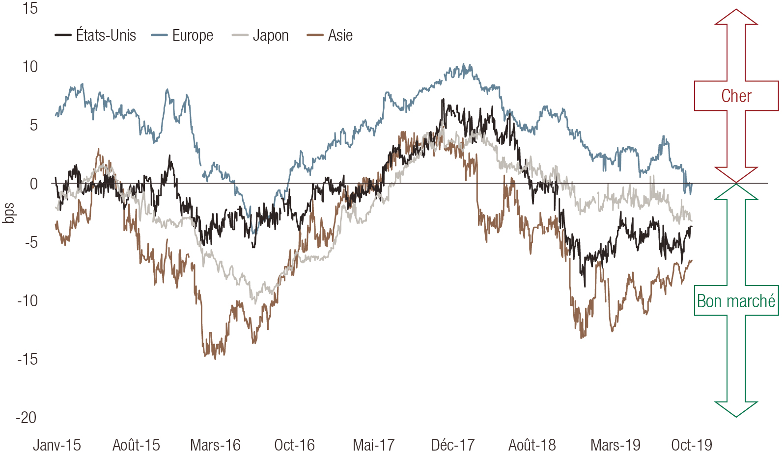 Source: LOIM. Écart (différence en points de pourcentage) entre la VI (volatilité implicite) et la VR (volatilité réalisée sur 260 jours) par région. La performance passée ne constitue pas une indication quant à la performance future.